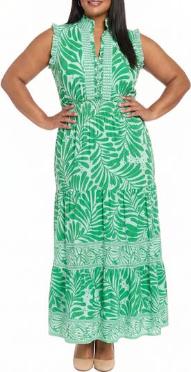 A tropical print enhances the sunny-day charm of this lightweight maxi dress framed by a ruffled collar and gracefully tiered skirt.