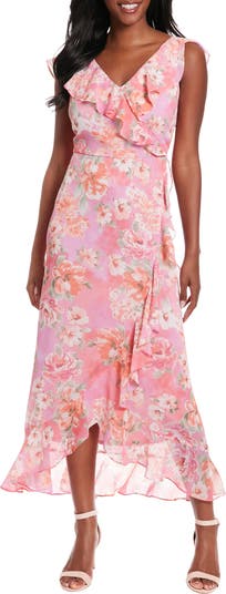 Ruffles cascade down the front of a faux wrap maxi length dress that is printed with romantic florals.