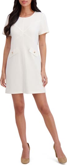 Diagonal seams enhance the sartorial appeal of a short-sleeve shift dress punctuated by gleaming hardware and faux flap pockets.