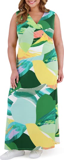 A faux-wrap silhouette defines the waistline of a woven maxi dress done in an abstract print for an eye-catching finish.