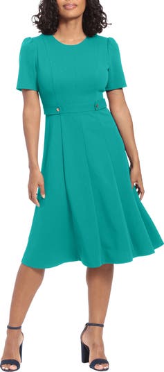 Easily transition from your desk to happy hour cocktails in this fit-and-flare dress framed by a jewel neckline and elongated short sleeves.