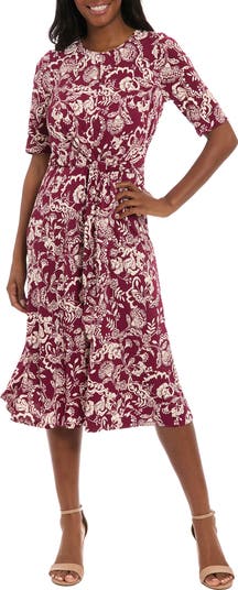 A side tie creates a unique gathered effect on this jersey midi dress rendered in an eye-catching print and cut with comfortable stretch.
