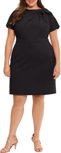 Tie details create an asymmetrical neckline on a classic sheath dress finished with smart short sleeves.