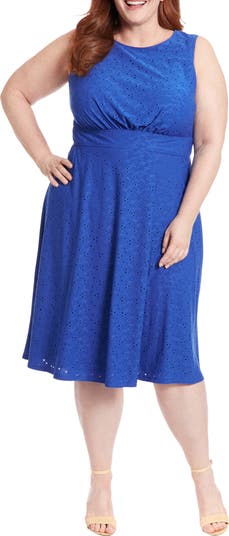 Embroidered eyelets sweeten a charming fit-and-flare dress fashioned with a gently gathered waist in a midi-length silhouette.