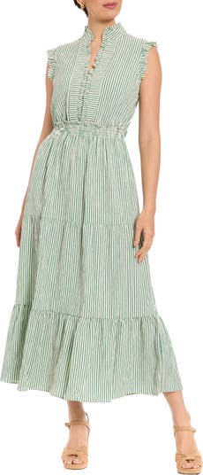 Slender stripes enhance the sunny-day styling of this flowy tiered maxi finished with a smocked waist and ruffles along the neckline.