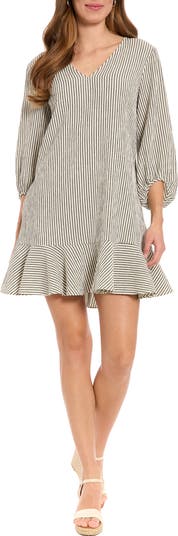 Pretty puff sleeves and a ruffled hem frame this striped seersucker dress perfect for the warmer months.