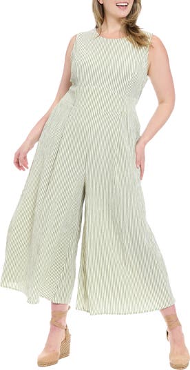 Get one-and-done style with this sleeveless wide-leg jumpsuit featuring slender stripes and handy pockets for casual appeal.