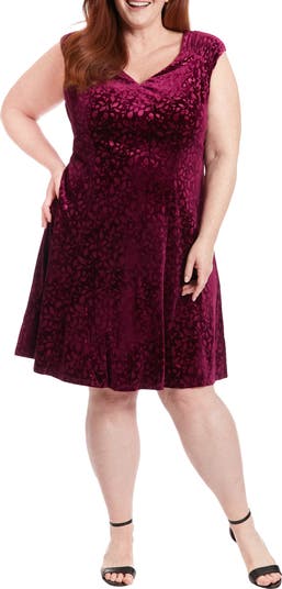 Textured leaves enrich this sleeveless velvet dress fashioned with shirred shoulders and a gracefully flared silhouette.