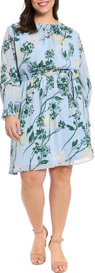 A matching tie snatches the waistline of a stem-showing dress patterned by pretty outlines of florals and foliage.