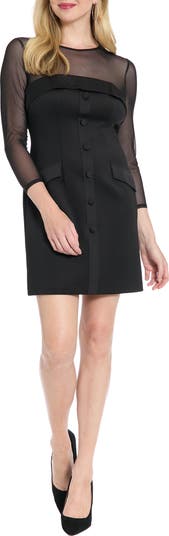 A powermesh illusion yoke and sheer sleeves frame this tuxedo-inspired minidress cut in an elegant sheath silhouette.