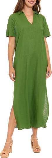 Feel effortlessly stylish in this v-neck maxi dress cut from a breathable linen-based blend and fashioned with side slits for easy moving.