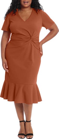 A side twist accents this woven V-neck midi dress with a flounce hem finish.