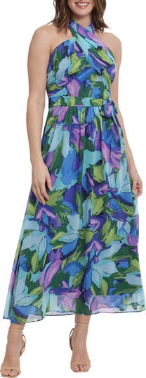 Vibrant, sophisticated floral printing decorates a maxi dress with a twisted halter neckline for a refined, en vogue style.