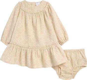 This cotton-gauze dress keeps baby feeling cute and cozy with dainty ruffles and matching bloomers that complete their look.
