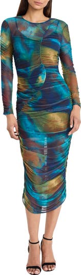 A roaming scrunch seam defines the illusive look of a long-sleeve dress that's cut from soft, stretchy fabric.