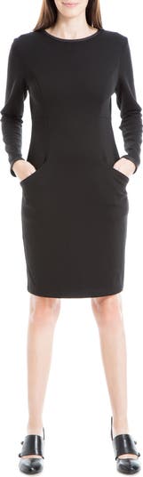 A seamed dress with a crewneck design and long sleeves is complete with pockets for hands-free style.