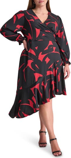 A surplice neckline and asymmetric flounce hem add graceful charm to this long sleeve dress in a bold pattern.