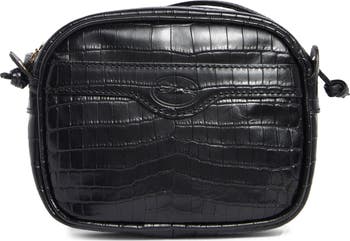 A croc-embossed finish complements this compact, leather bag equipped with an adjustable crossbody strap for easy, hands-free versatility.