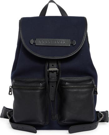A timeless, multi-pocket backpack features tough twill with smooth leather construction and soft webbed shoulder straps to serve as a sophisticated commuter essential. Longchamp's 3D collection effortlessly blends modern design with a love of symmetry, using contrasting stitching and raised accent panels to create a three-dimensional visual effect.