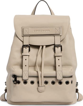 A slim-profile backpack features logo-stamped grommets and smooth leather construction serves as a sophisticated commuter essential with handy storage pockets inside and out.