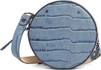 A croc-embossed finish complements this compact, leather bag equipped with an adjustable strap for easy, hands-free versatility.