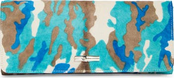 High-polish hardware creates a striking focal point at the front of this genuine-calf-hair clutch covered in colorful camo.