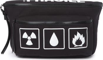 - - Zip closure - Adjustable belted waist - Zip exterior pocket with graphics - Exterior features 1 zip pocket and logo print details - Interior features 1 slip pocket and 6 card slots - Approx. 7”H x 12”W x 3”D - Approx. 17” strap - Imported