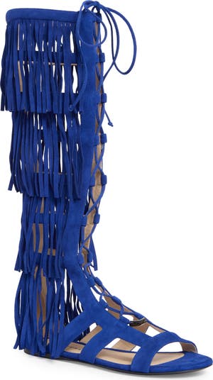 Rich leather shapes this gladiator-inspired sandal detailed with strappy construction and layered fringe tiers, all secured by a full-length back zipper for easy wear.