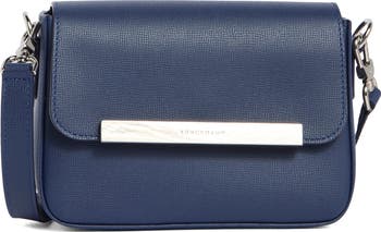 A polished logo plaque sits perfectly on the flap of a leather crossbody bag done with a petite interior to easily store essentials.