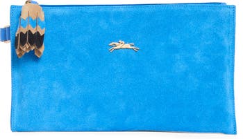 A wristlet pouch made from buttery suede features a logo hardware accent to offer a signature appeal for quick outings.