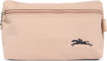 A nylon cosmetic bag with a leather trim keeps your toiletries or makeup essentials stored safely during travel.