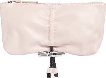 Perfectly sized to carry your essentials, this compact leather clutch is finished with a polished drawstring accent at the center.
