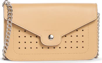 A perforated front panel and signature hardware elevate the aesthetic of a slim leather wallet on a chain. A well-organized interior and a polished chain crossbody strap offer effortless hands-free wear.