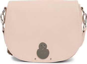 A logo-engraved turnlock adds refined polish to a structured leather crossbody bag featuring an optional webbing strap for convenient styling.
