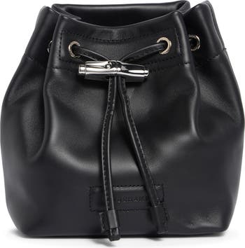 Gleaming hardware and a rich leather exterior elevate a scaled-down bucket bag fitted with a crossbody strap for hands-free carrying.