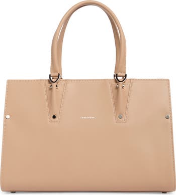 Fine leather construction and polished hardware complement the clean, elegant style of a compact tote fitted with a triple-compartment interior.