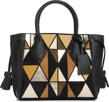 A fresh take on Longchamp’s Penelope bag, this leather tote features geometric patchwork, drawstring tassels and sleek rolled handles.