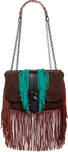 This smooth suede handbag channels unmistakable bohemian style thanks to fringe trim, braided piping and an equestrian-inspired buckle detail. A pull-through chain strap provides multiple carrying options for maximum carefree style.