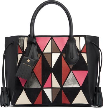 Geometric panels of mixed-texture leather and textile create a kaleidoscopic effect across this scaled-down handbag.