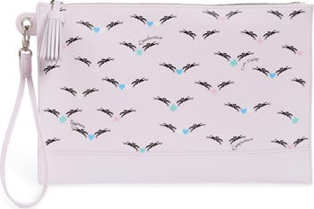 A colorful equestrian motif adds eye-catching flair to a compact clutch cut from supple leather and furnished with an optional wrist strap.