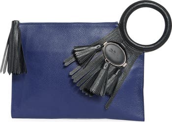 Fringed tassels emphasize the vintage inspiration of this colorblocked leather clutch designed with a circular handle cutout and a signature embossed horse-and-jockey logo.