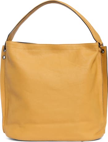 Leather construction and an embossed-logo patch highlight the durable exterior of a slouchy hobo bag featuring a spacious interior.