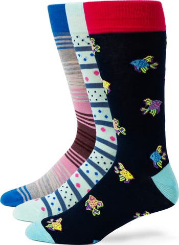 Italian crafted cotton-blend yarns make up this pack of assorted crew socks that feature eye-catching patterns like colorful fish and stripes.