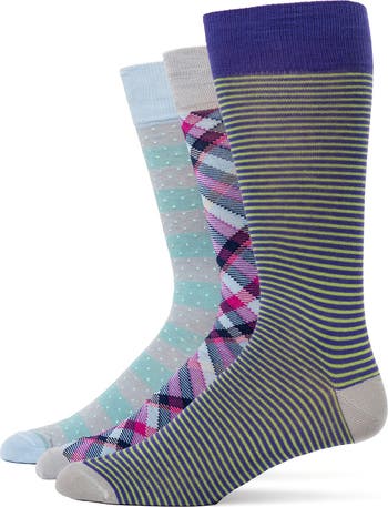 Step up your sock game with this trio of cotton-forward crew socks featuring stripe, plaid and dotted patterns.