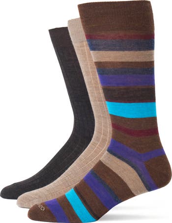 An assortment of patterns and solid hues decorate these Italian-made dress socks made of stretchy merino wool in a comfortable crew length.