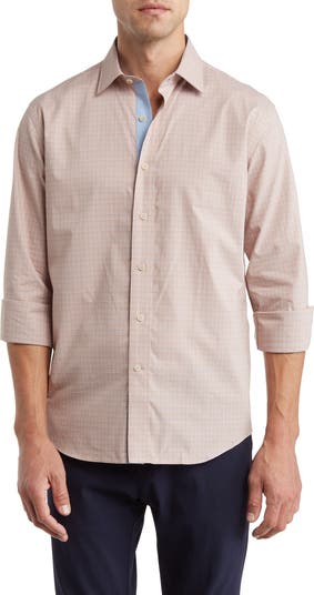 A check pattern distinguishes a cotton button-up shirt featured in a trim fit for a tailored appearance.
