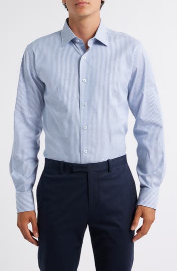 Pale-blue cotton oxford cloth made in part with organic fibers relaxes the formality of a dress shirt that's patterned in chalky pinstripes and finished with a neat French placket. Crafted with a touch of enhanced stretch, it makes a versatile, all-season addition to your semiformal wardrobe.