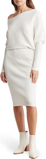 A simple, yet utlrachic sweater dress is framed with an off-the-shoulder neckline and long sleeves.