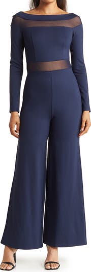 Mesh cutouts bring instant allure to an off-the-shoulder jumpsuit fashioned in a wide-leg silhouette.
