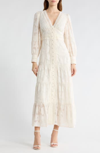 Embroidered floral lace brings romantic style to a long-sleeve maxi dress fashioned with a plunging neck, puff gathered sleeves and tiered maxi-length skirt.